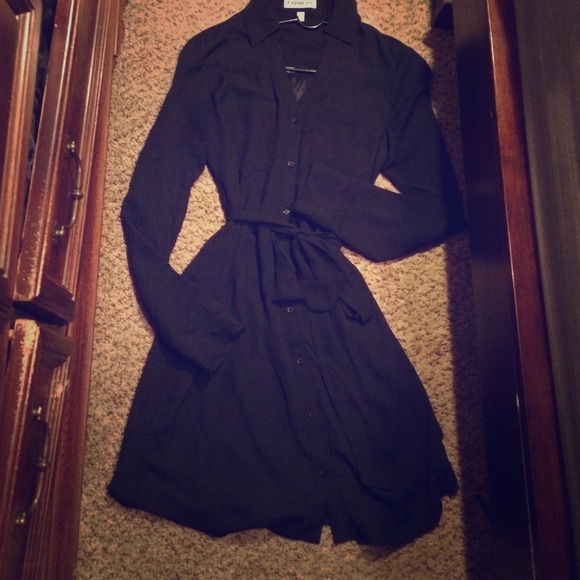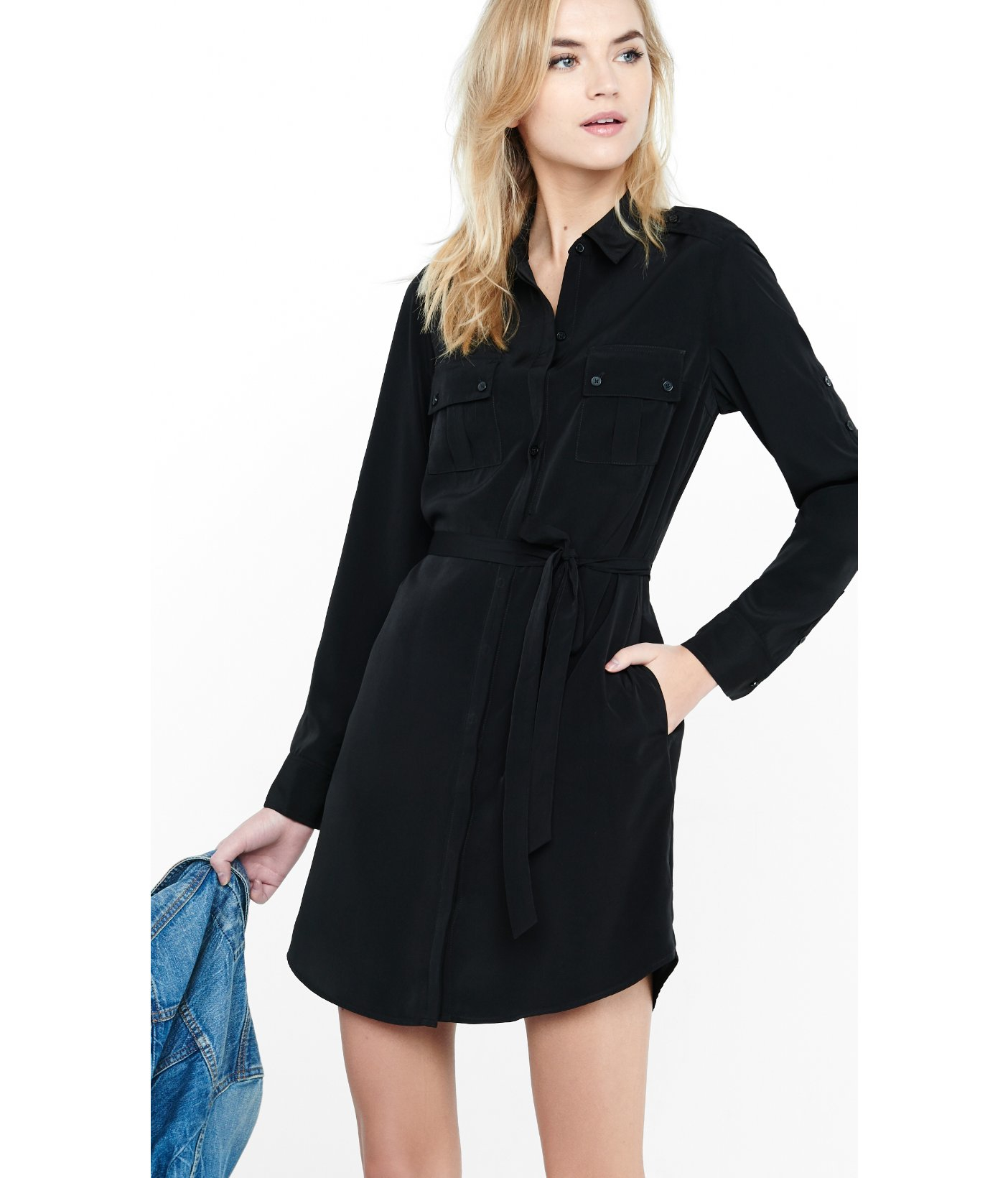Black shirt dress with roll up sleeves and cloth belt.